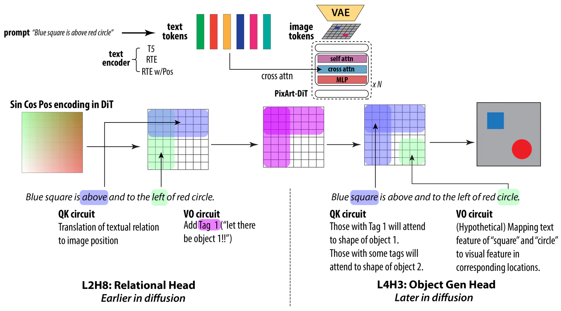 We investigate mechanistic interpretability in Diffusion Transformers (DiTs) for text-to-image generation, focusing on how these models generate correct spatial relations between objects. Training DiTs of varying sizes with different text encoders on a task requiring generation of images with two objects whose attributes and spatial relations match text prompts, we discover that spatial-relation information is passed to image tokens through a two-stage circuit involving separate cross-attention heads when using random text embeddings. With pretrained T5 encoders, the DiT employs a different circuit that leverages information fusion in the text tokens. Notably, while both approaches achieved similar in-domain performance, their robustness to out-of-domain perturbations differed significantly, suggesting challenges in generating correct spatial relations in real-world applications.